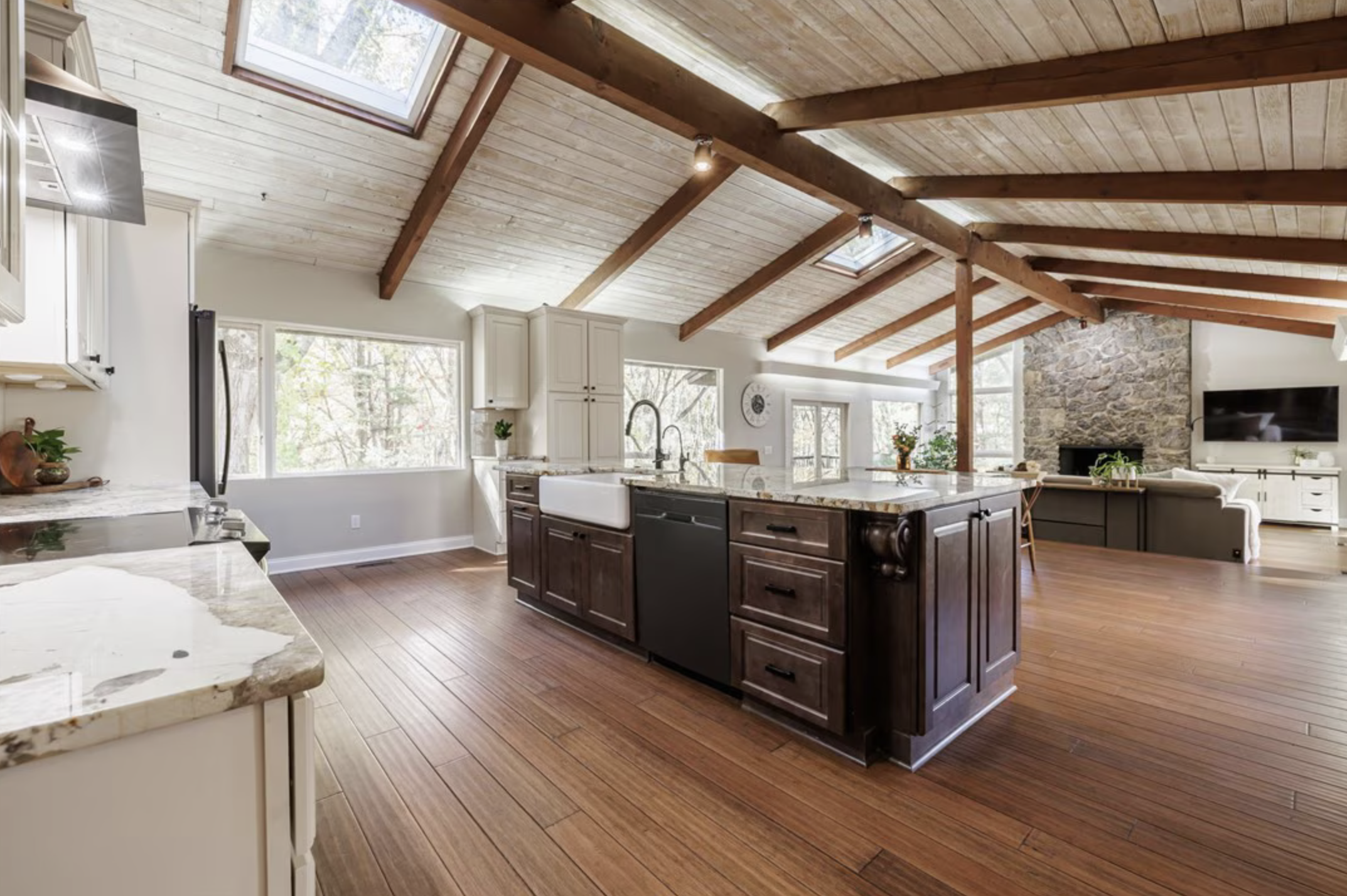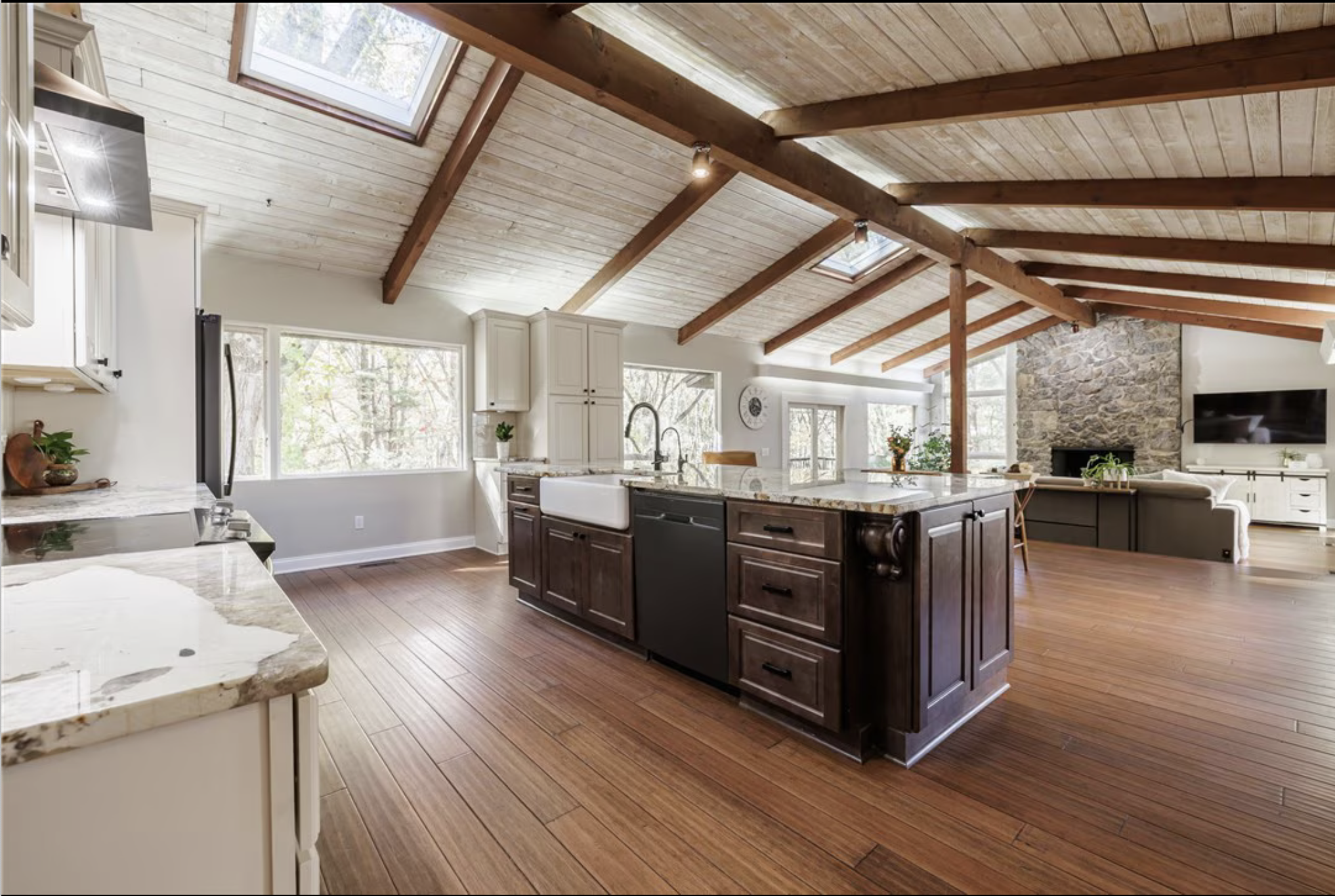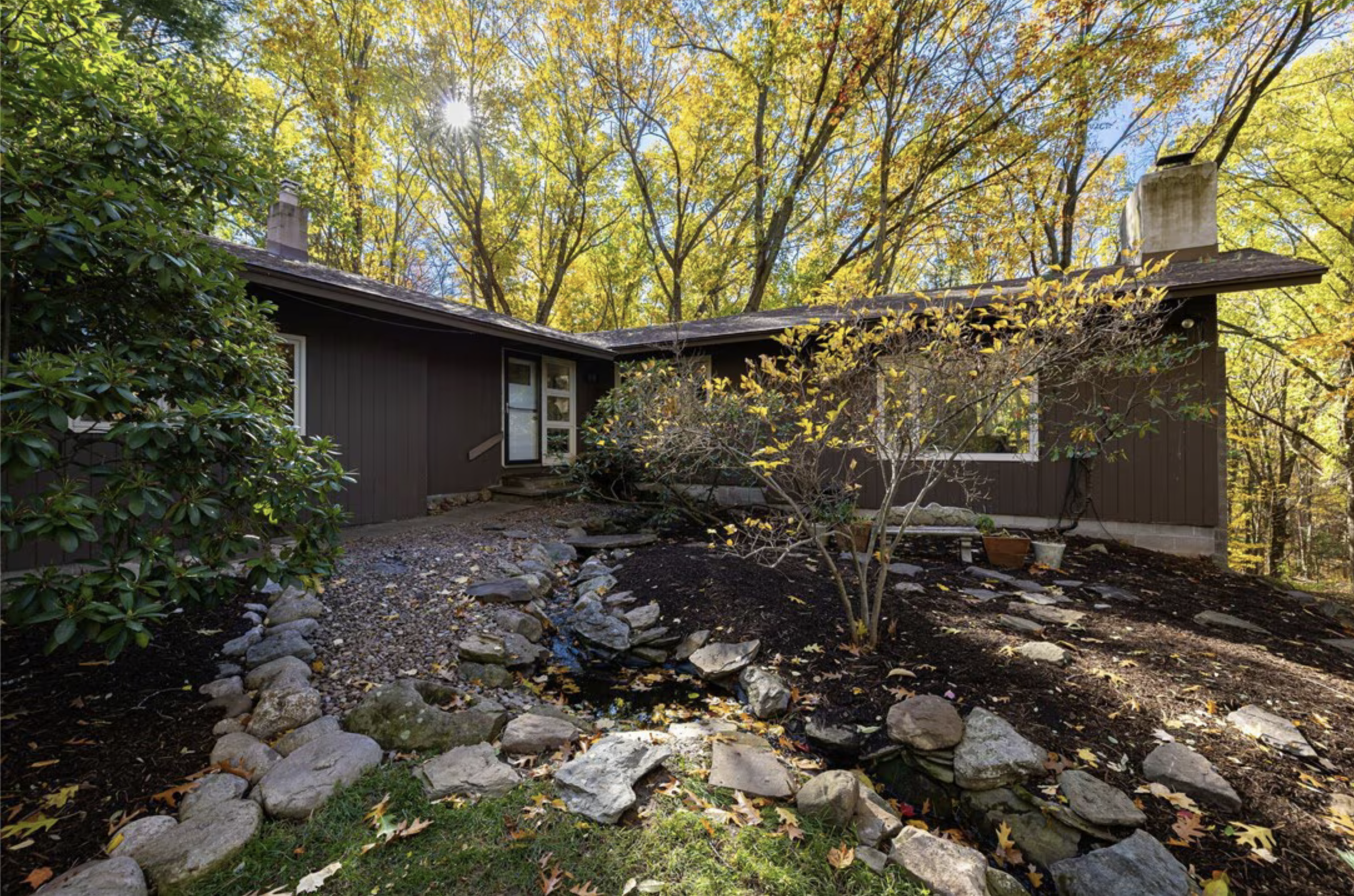 Designed by renowned architect Don Hershey, this remarkable 5 bedroom, 3 full bath ranch blends timeless mid-century design with stunning modern updates on nearly 6 private acres backing to Lilly Pond. The fully remodeled kitchen is the heart of the home, featuring an expansive island with breakfast bar, granite counters, custom cabinetry, & an open-concept layout perfect for entertaining & everyday living. The main level showcases beautiful hardwood floors, grand ceilings, skylights, & southern-facing windows that fill the home with natural light. The great room serves as a true centerpiece — featuring a floor-to-ceiling fossil-stone wood-burning fireplace, large windows overlooking the property, & sliding-glass doors leading to the private deck. The primary suite includes hardwood floors, a fully updated ensuite bath with double sink vanity, tile shower with glass door, first-floor laundry, & its own sliding-glass doors opening to the deck, offering a peaceful retreat. An office along with a bonus room which connects the garage to the main living area add versatility & functionality to the main floor. The lower walkout level, included in the square footage, offers four bedrooms, including the standout “Cave Room” — an ode to the home’s location on Cavan Way — featuring heated ceramic tile floors & sliding-glass doors that open to the new lower-level patio. This level also includes two fully updated full bathrooms, a relaxing sauna & an additional bonus room. The remaining rooms feature brand-new carpet & fresh paint, highlighting the home’s extensive renovations. Outside, enjoy a tranquil water feature, beautiful landscaping with mature rhododendrons. This one-of-a-kind Don Hershey masterpiece seamlessly blends artistry, function, & modern comfort.