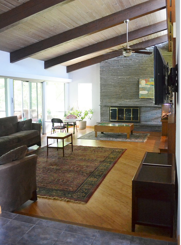 Open floor plan with soaring spaces, strong lines, huge slate fireplace, beamed ceilings, large windows for views of nature, multi level living spaces and large overhangs. Original cabinetry and built ins. Kitchen has teak cabinets. (excerpt from Zillow)
